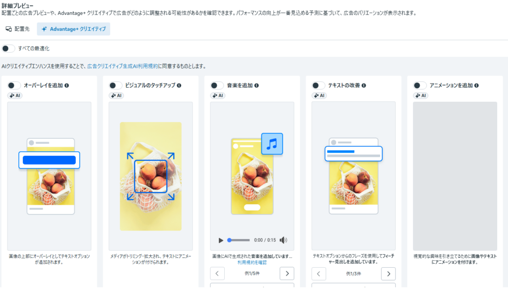 Metaが提供する「標準エンハンス(自動改善)」や「AI生成テキスト」などの機能は強力ですが、全てをオンにするのは危険です。